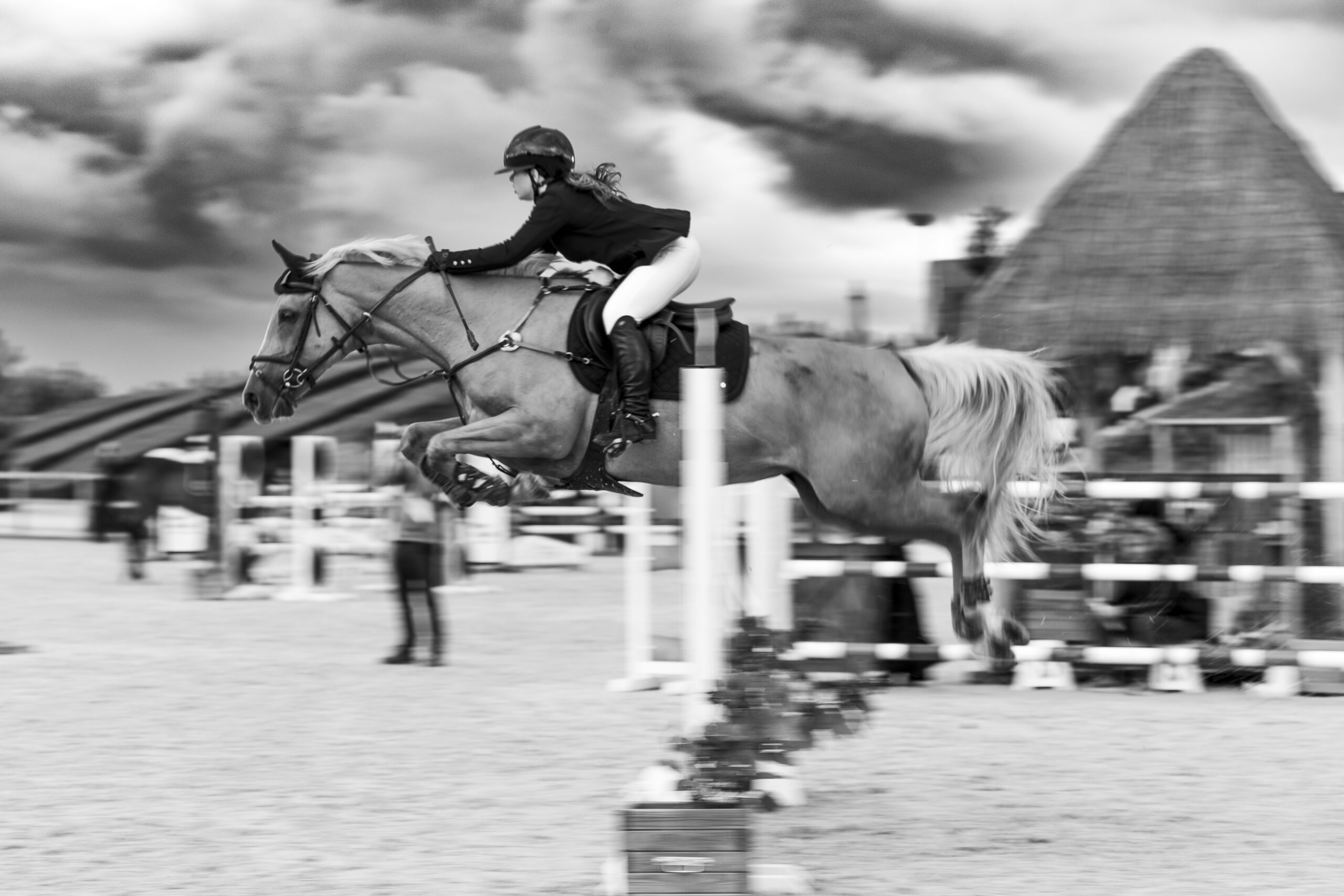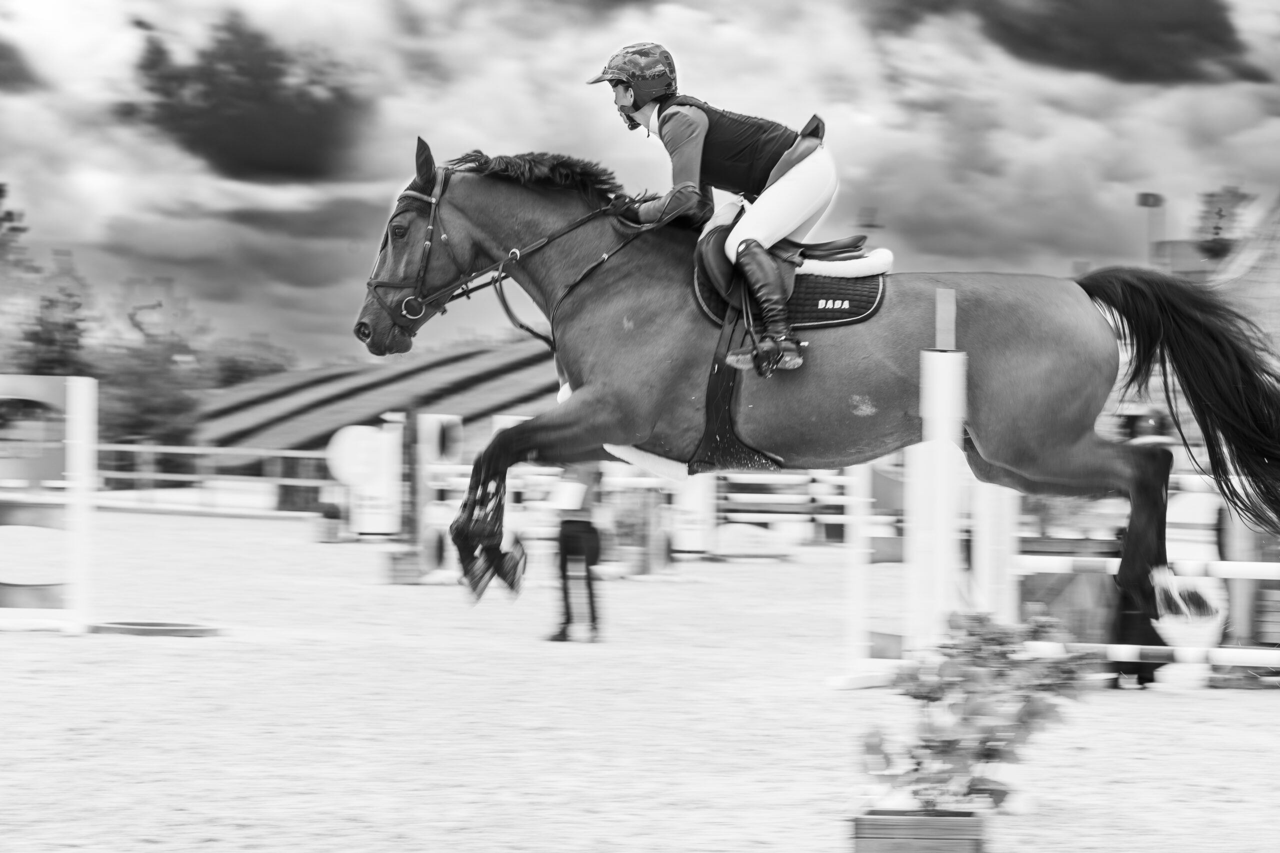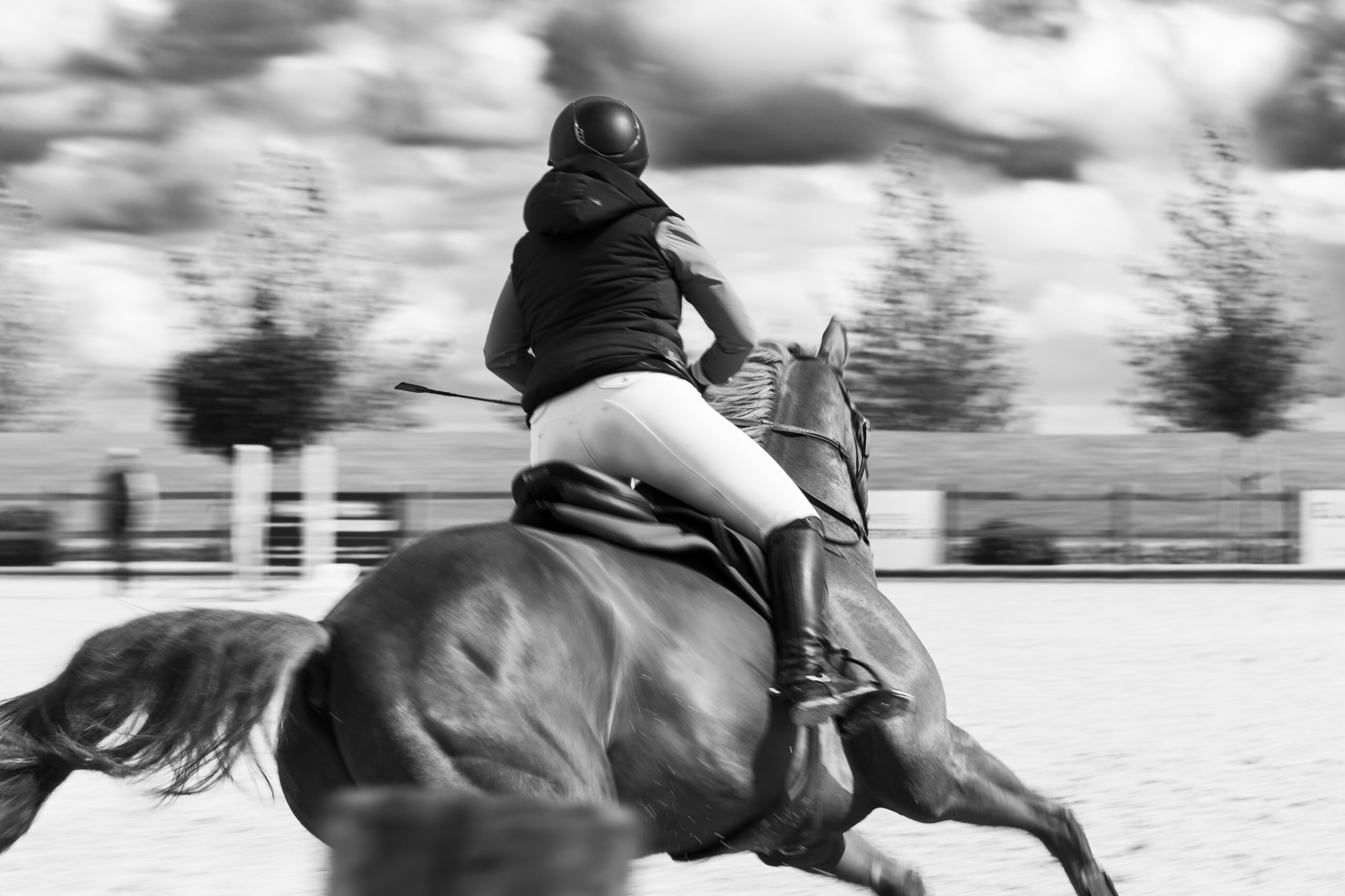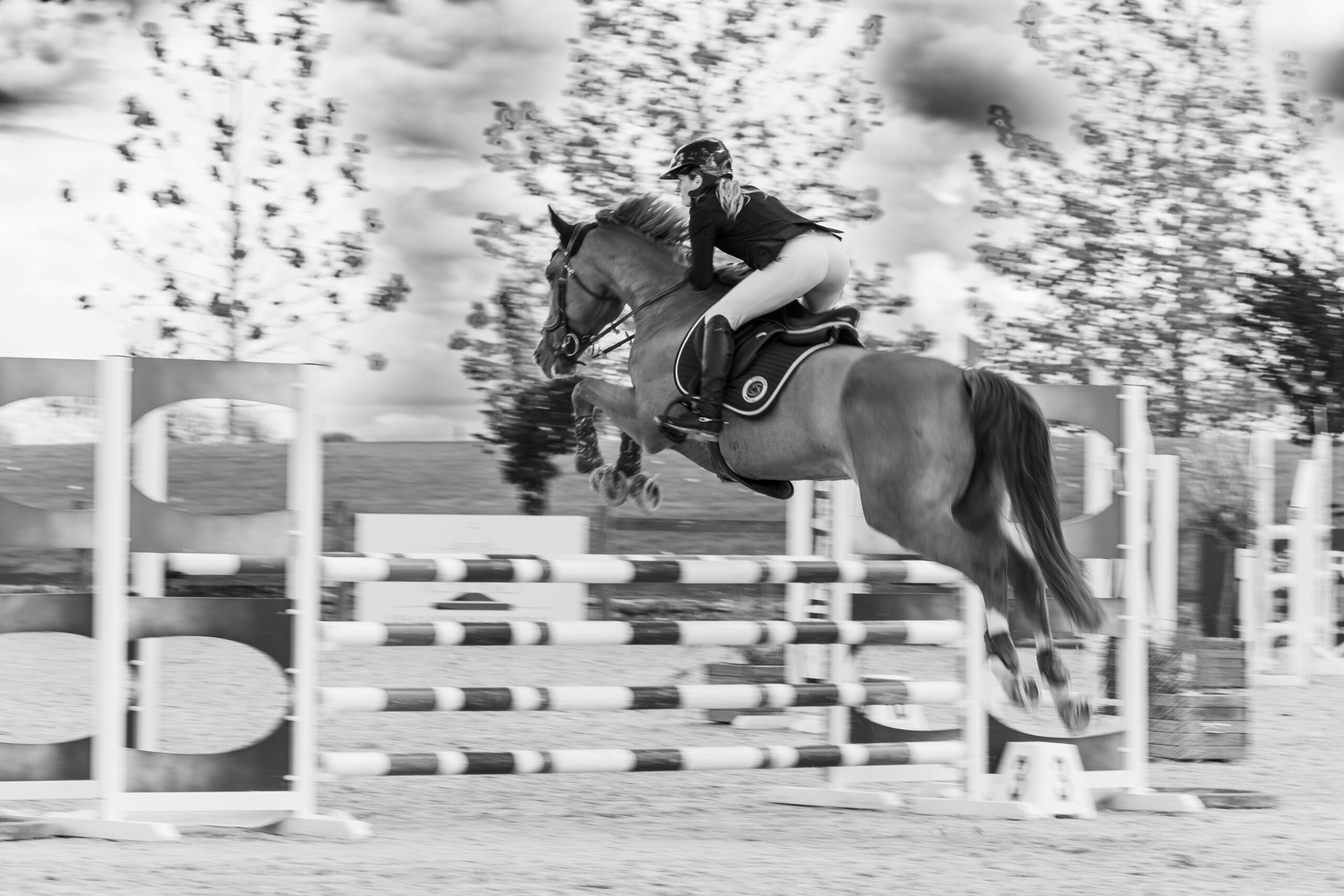 Images avec du flou de mouvement fait à la prise de vue en pause longue pour garder une trace du mouvement de l’animal et de sa/son cavalier/ère.