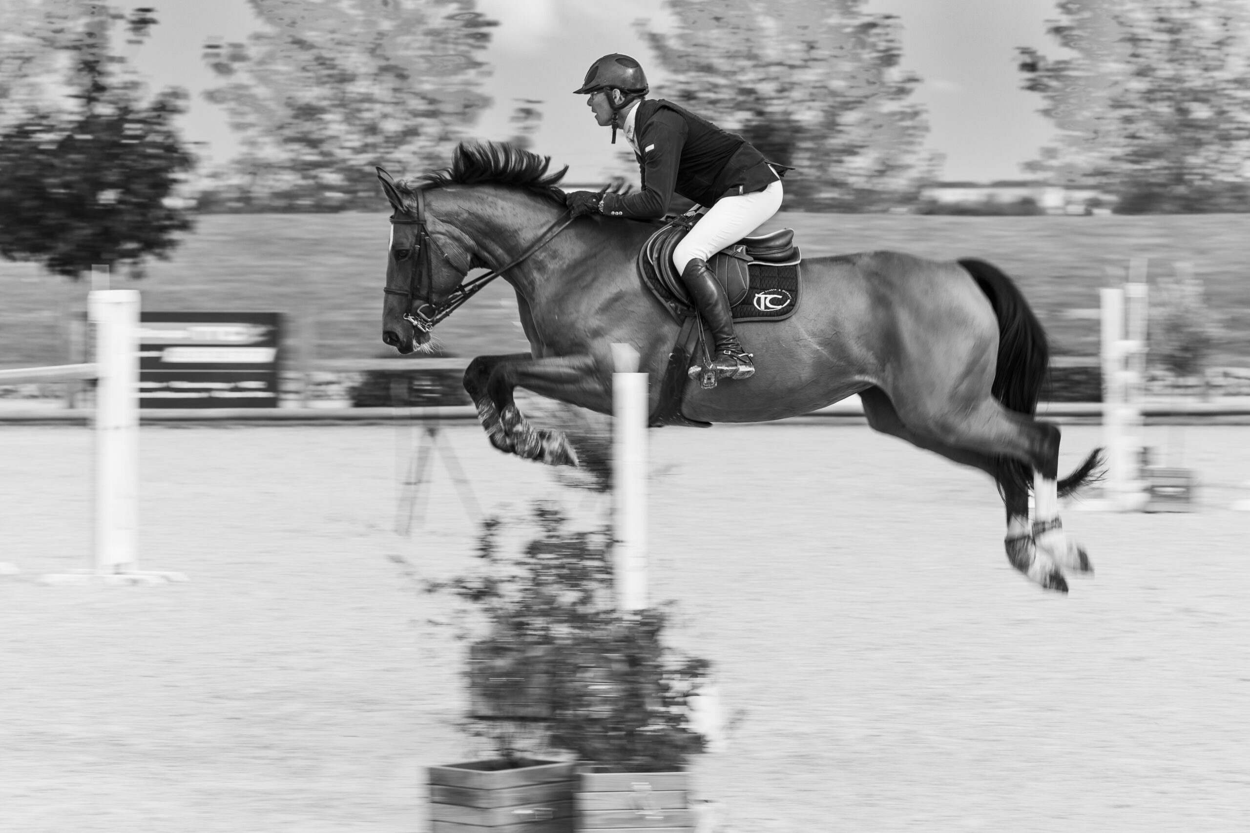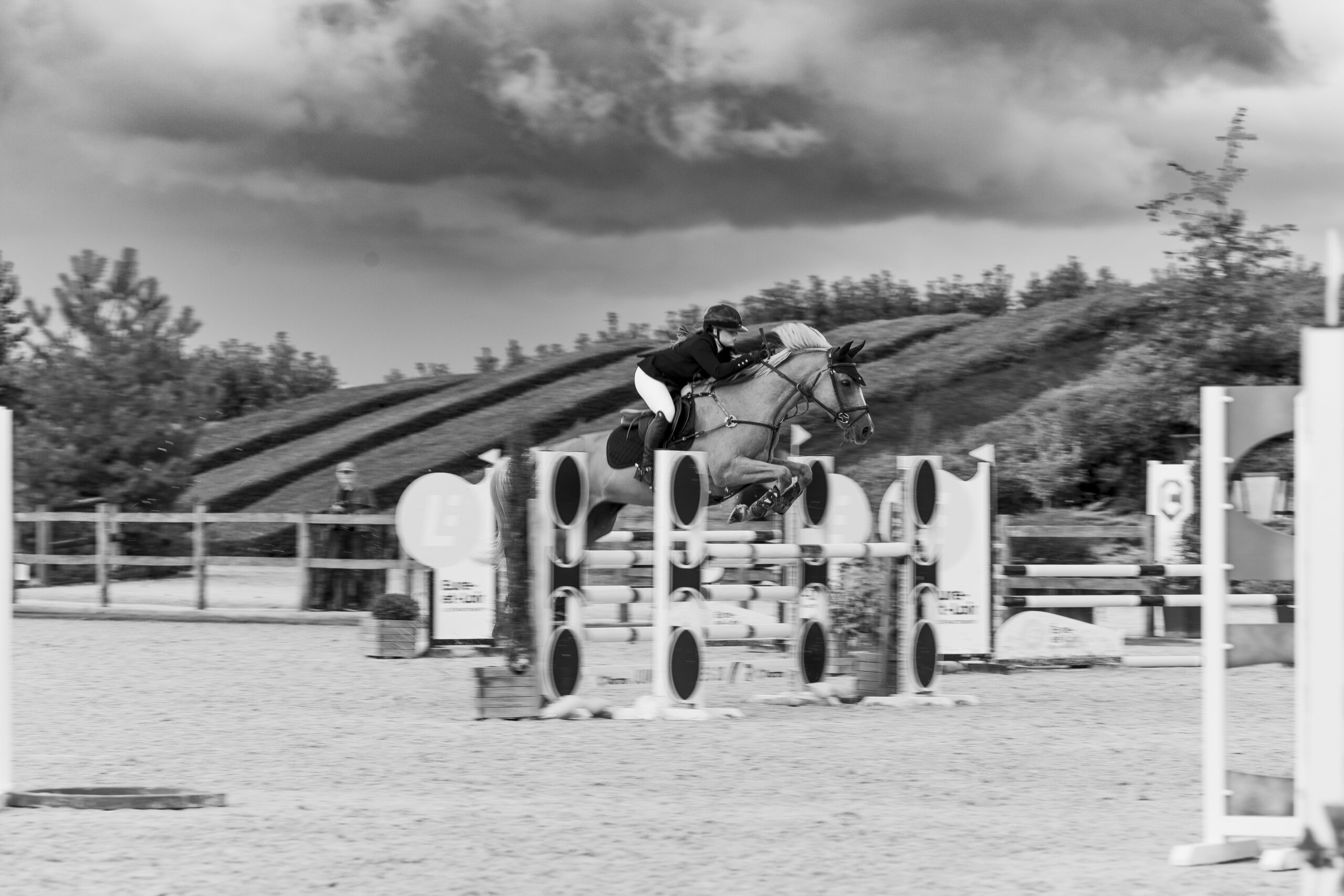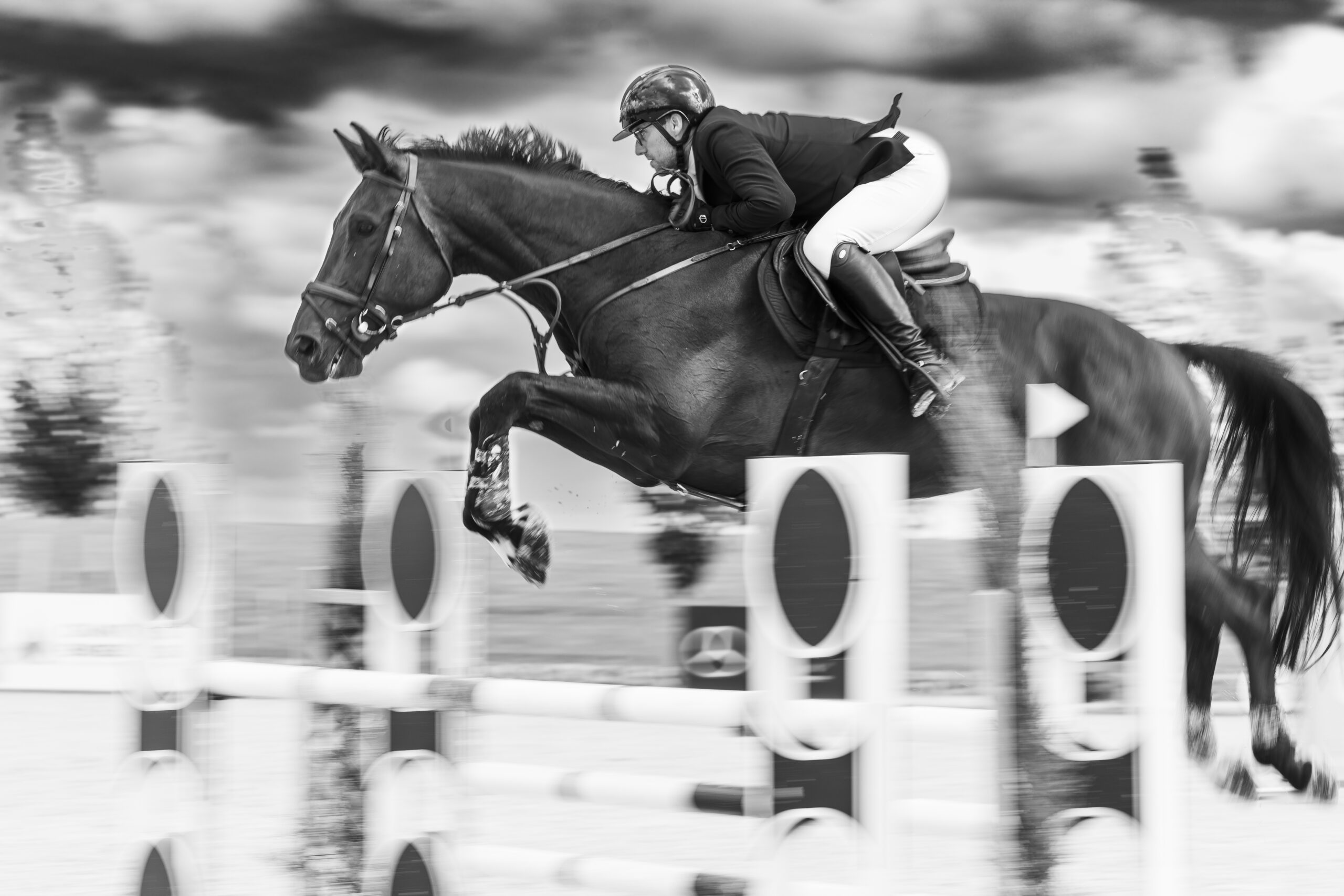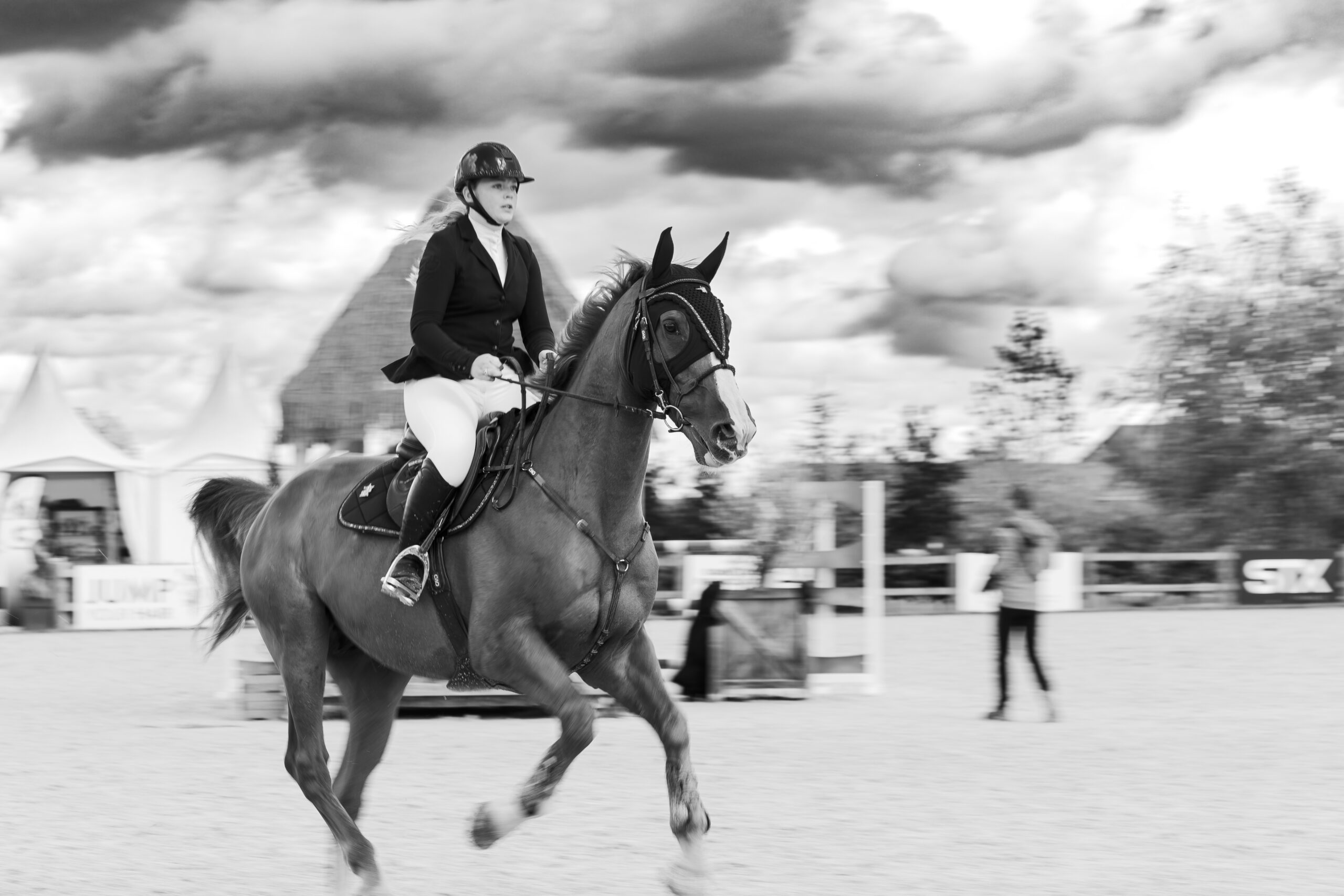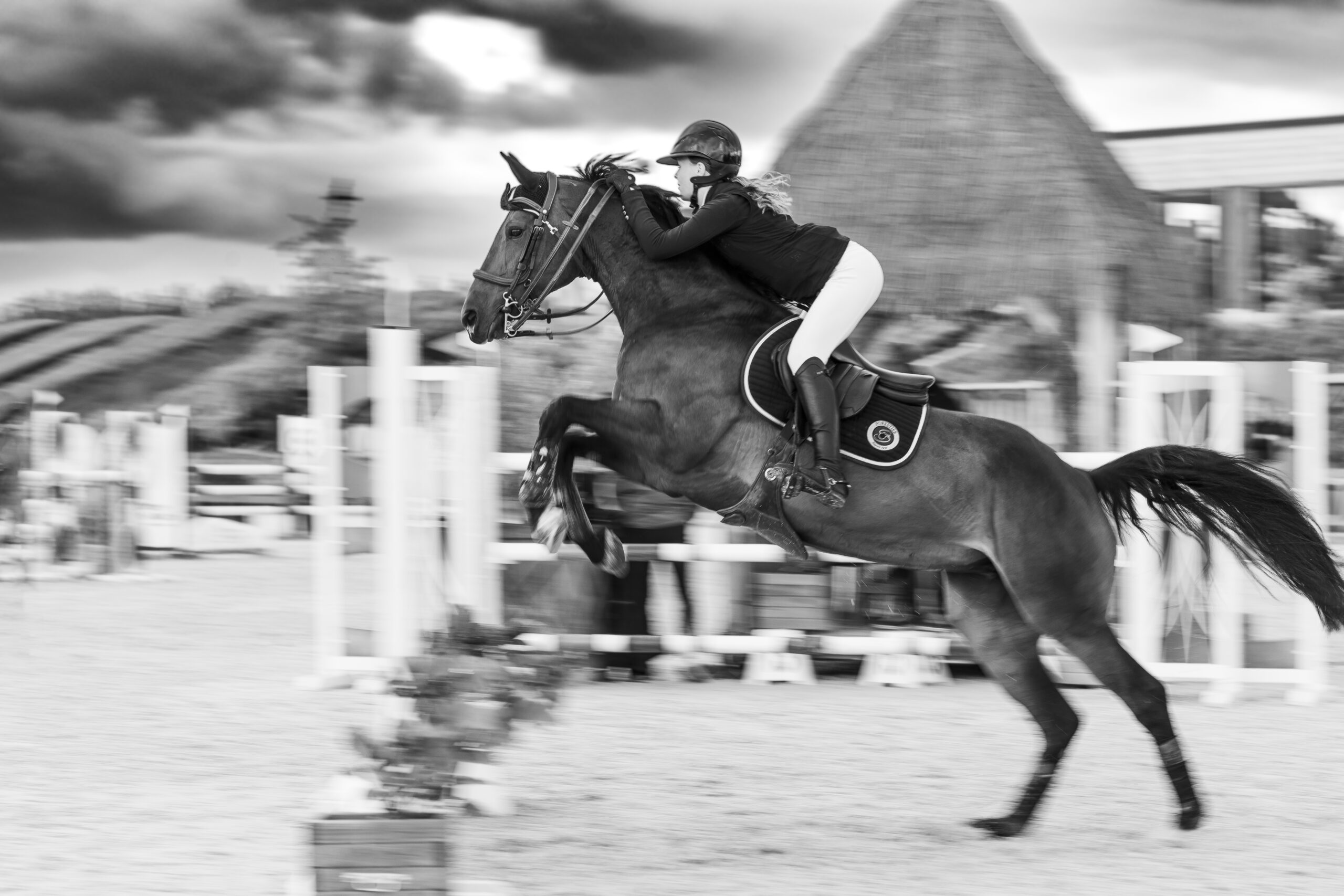 Images avec du flou de mouvement fait à la prise de vue en pause longue pour garder une trace du mouvement de l’animal et de sa/son cavalier/ère.